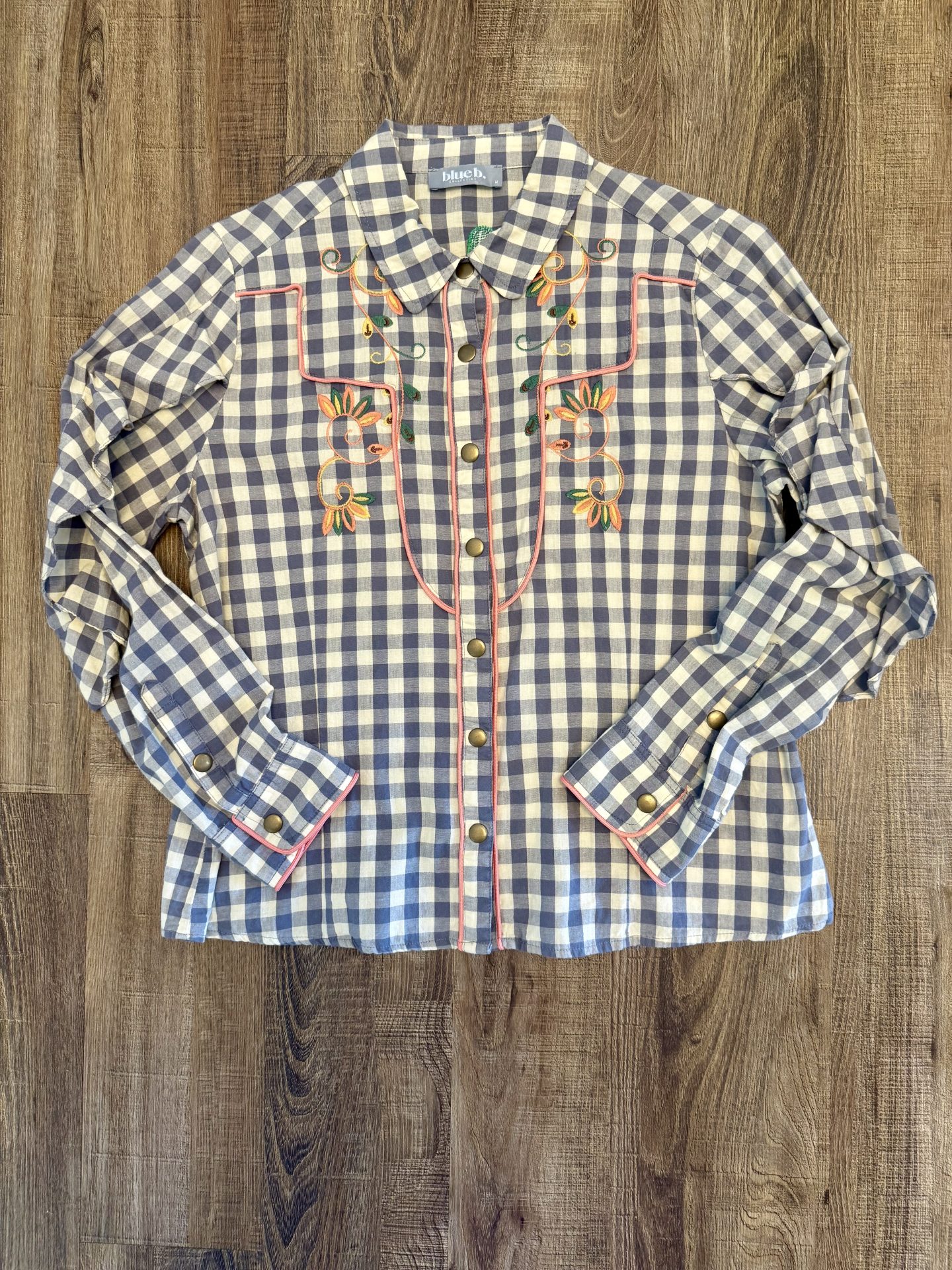The detail on this gingham check shirt is gorgeous! It features floral embroidery and ruffled sleeves with contrast piping and snap buttons. The back has a beautiful embroidered bold cactus.