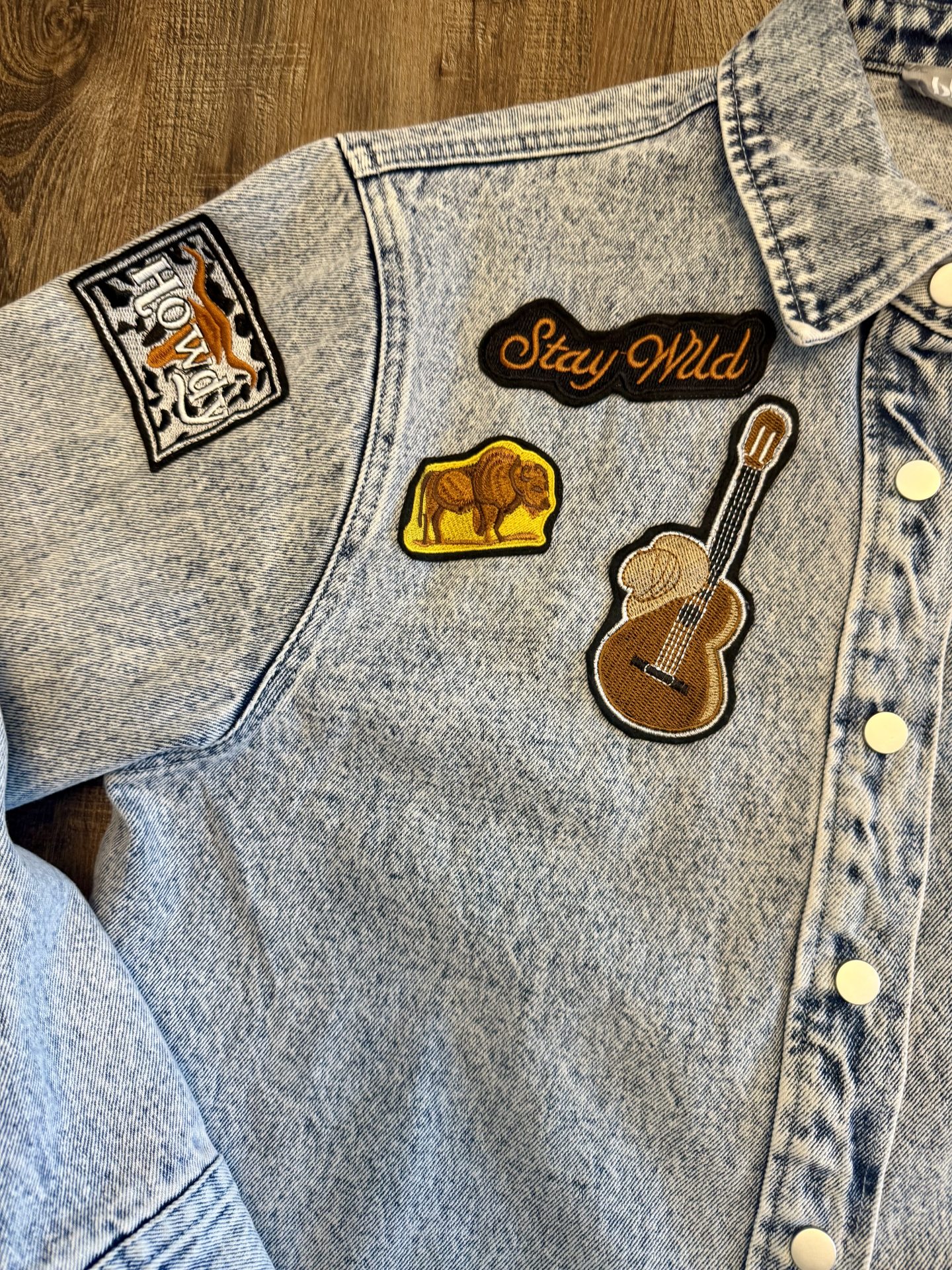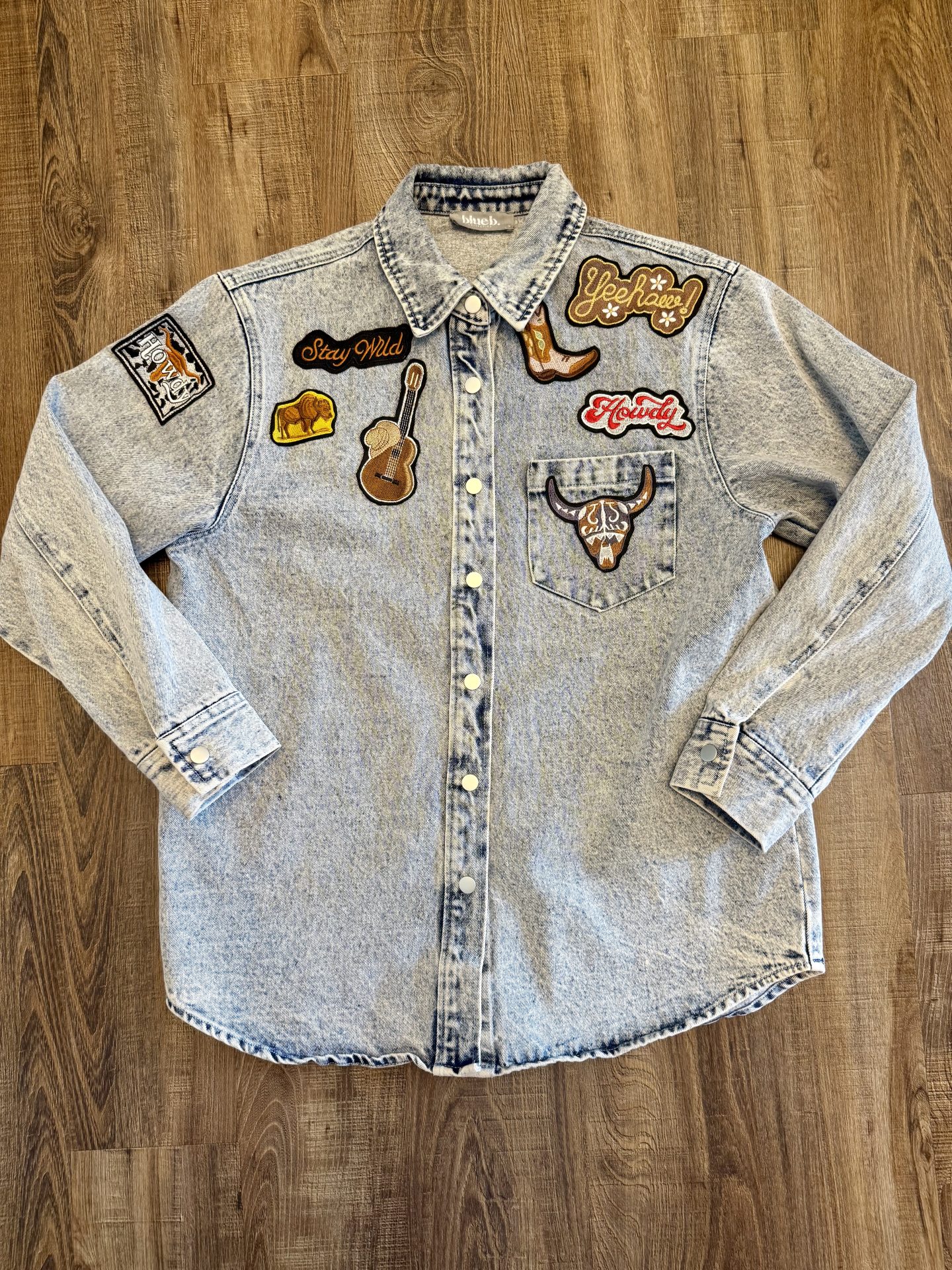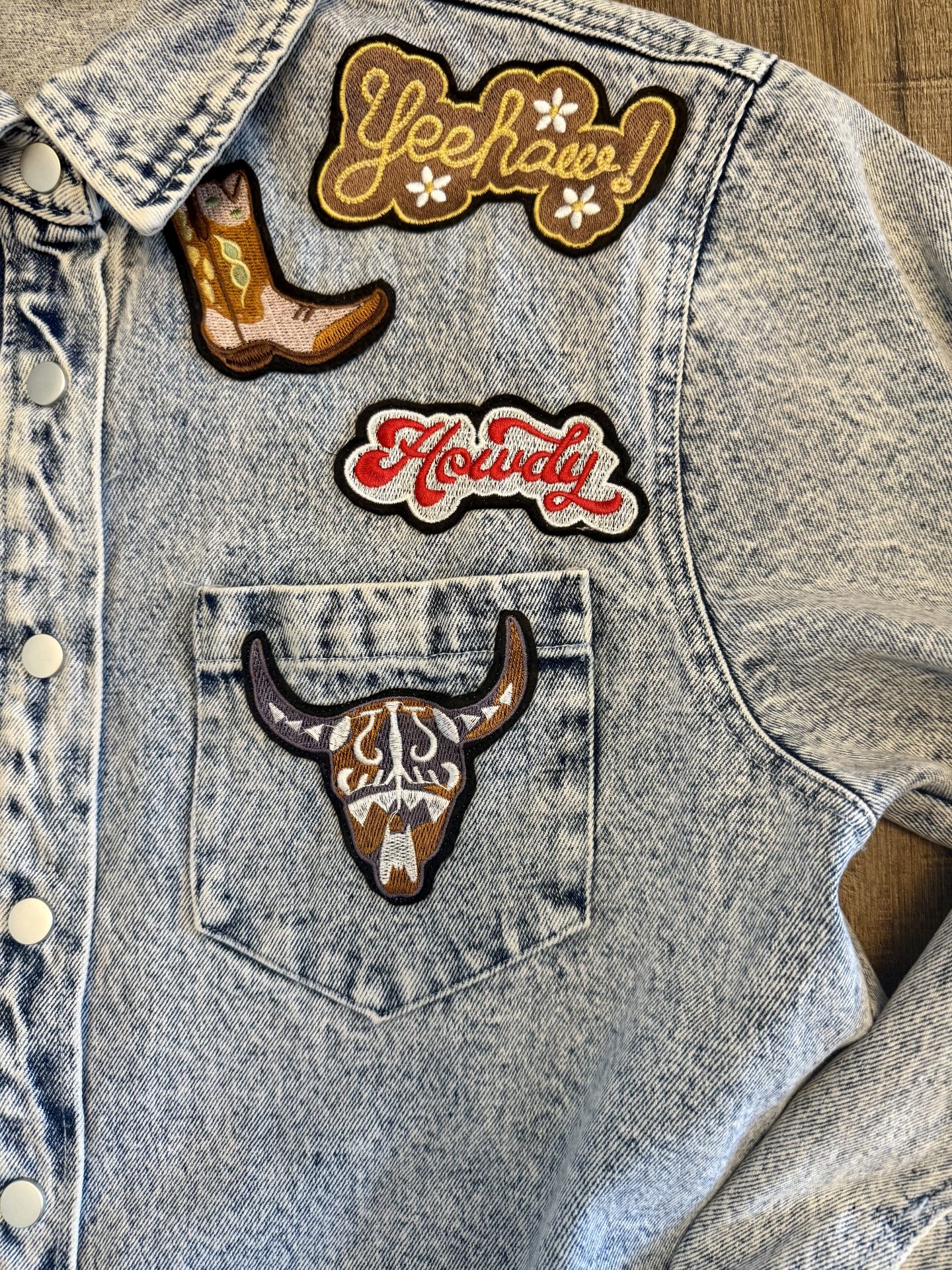 This patchwork denim jacket is screaming cowgirl and rodeo.  A versatile piece that can be worn alone or layered with your favorite tee, sweater or sweatshirt.