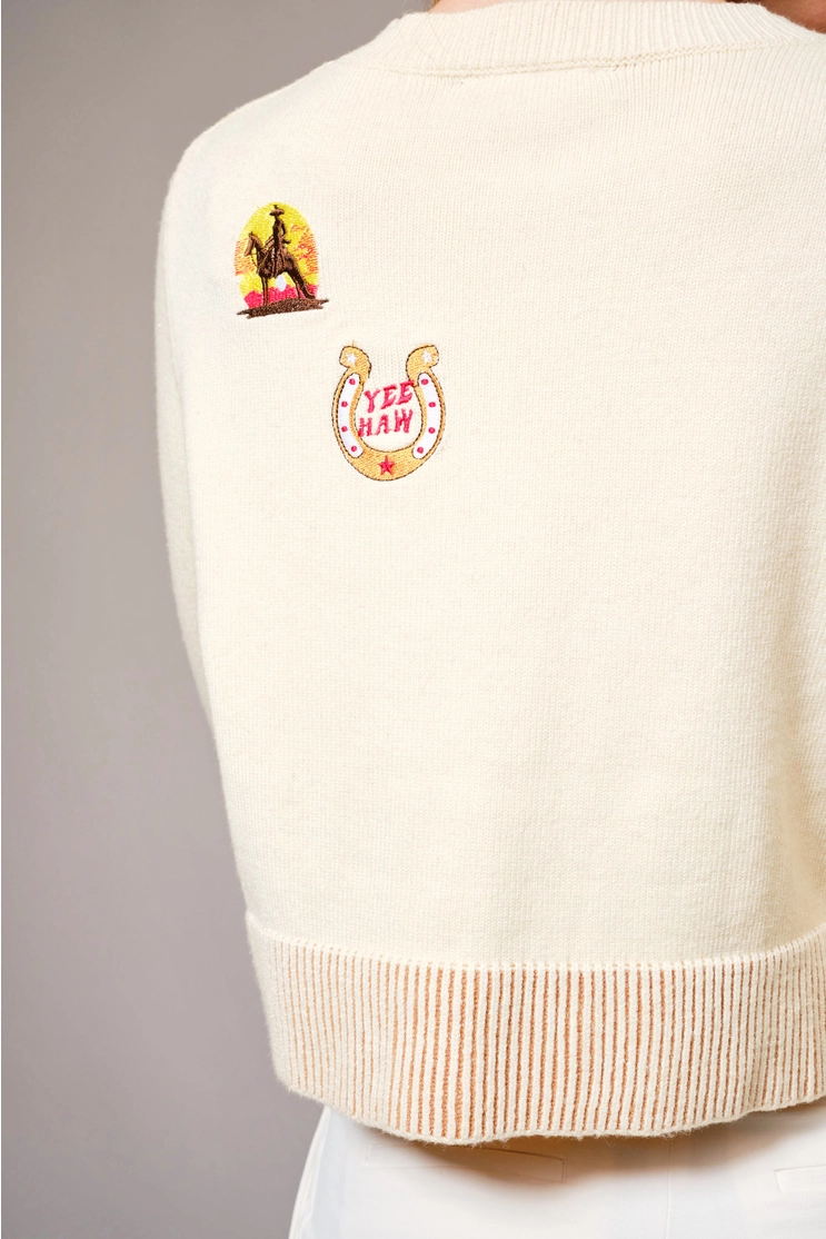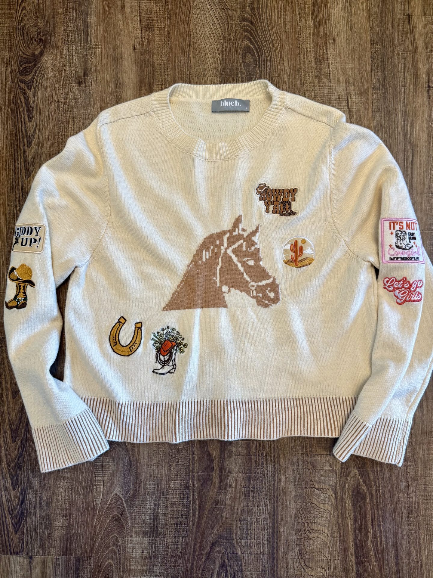 So cute! This ivory crop sweater with horse graphic, western patch accents, will get you compliments everywhere you go!